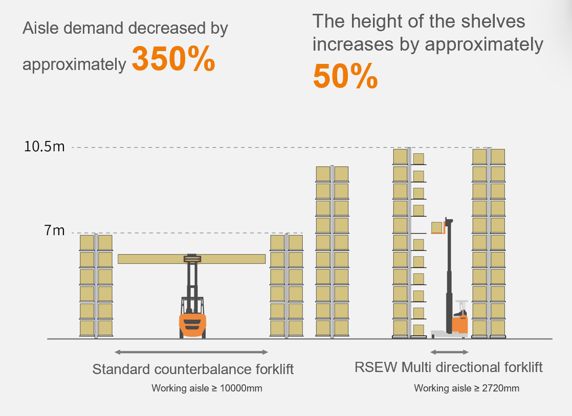 โหมดการขับขี่ที่เป็นเอกลักษณ์ของ RSEW ทำให้ได้เปรียบอย่างมากเมื่อจัดเก็บวัสดุที่มีความยาวในทางเดินแคบ ช่วยลดความจำเป็นในการใช้ช่องทางการขนส่ง และช่วยให้สามารถวางชั้นวางได้มากขึ้นในพื้นที่จัดเก็บที่มีจำกัด ซึ่งช่วยเพิ่มประสิทธิภาพการใช้พื้นที่คลังสินค้าได้อย่างมาก