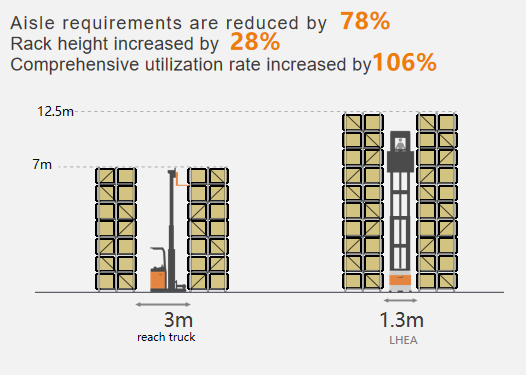 ด้วยข้อกำหนดด้านทางเดินที่แคบเป็นพิเศษเพียง 1.3 เมตร และความสูงในการยก 12.5 เมตร รถยก LHEA จึงสามารถใช้งานได้ในคลังสินค้าที่ติดตั้งรถยก VNA อยู่แล้ว เช่น คลังสินค้าสายการผลิตและคลังสินค้าอีคอมเมิร์ซ ความสามารถในการรับน้ำหนัก 1360 กิโลกรัมยังตอบสนองความต้องการในการหยิบสินค้าส่วนใหญ่ได้ และสามารถใช้งานร่วมกับรถยก VNA เพื่อการหยิบสินค้าอย่างรวดเร็ว