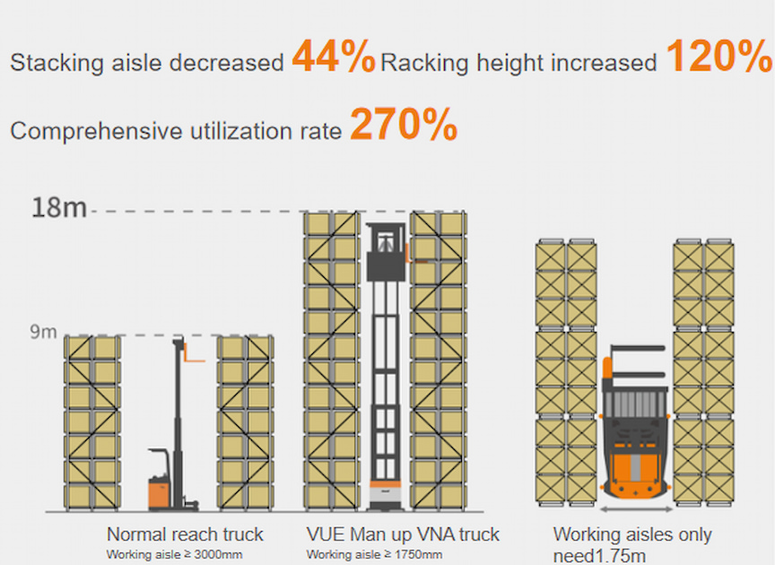 รถยก VUE รุ่นใหม่ล่าสุด มีความสูงในการยกสูงสุดถึง 18 เมตร และรับน้ำหนักบรรทุกได้สูงสุด 1,600 กิโลกรัม ความกว้างของทางเดินที่แคบเป็นพิเศษเพียง 1.75 เมตร ช่วยเพิ่มประสิทธิภาพการใช้พื้นที่คลังสินค้าได้อย่างมาก ทำให้มีคุณค่ามากยิ่งขึ้น