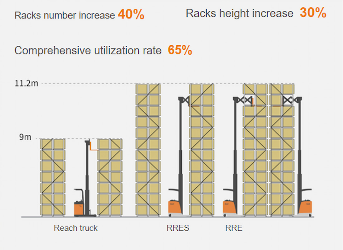 จำนวนชั้นวางต่อหน่วยพื้นที่เพิ่มขึ้นอย่างมาก ทำให้มีพื้นที่สำหรับวางพาเลทมากขึ้น ส่งผลให้ประสิทธิภาพการจัดเก็บสูงขึ้นเมื่อเทียบกับรถยกแบบธรรมดา