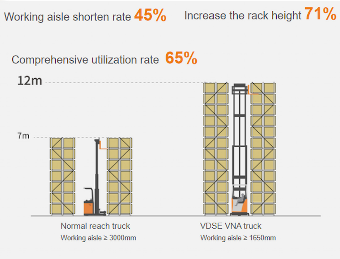 ด้วยช่องทางเดินทำงานกว้าง 1650 มม. สำหรับจุดศูนย์กลางการรับน้ำหนัก 600 มม. ทำให้สามารถจัดการกับสถานการณ์การวางซ้อนสินค้าที่หลากหลายได้อย่างง่ายดาย รุ่น VDSE มาพร้อมกับงาที่หมุนได้ 180° ด้วยระบบไฟฟ้า ทำให้การหยิบและวางสินค้าทำได้ง่ายยิ่งขึ้น
