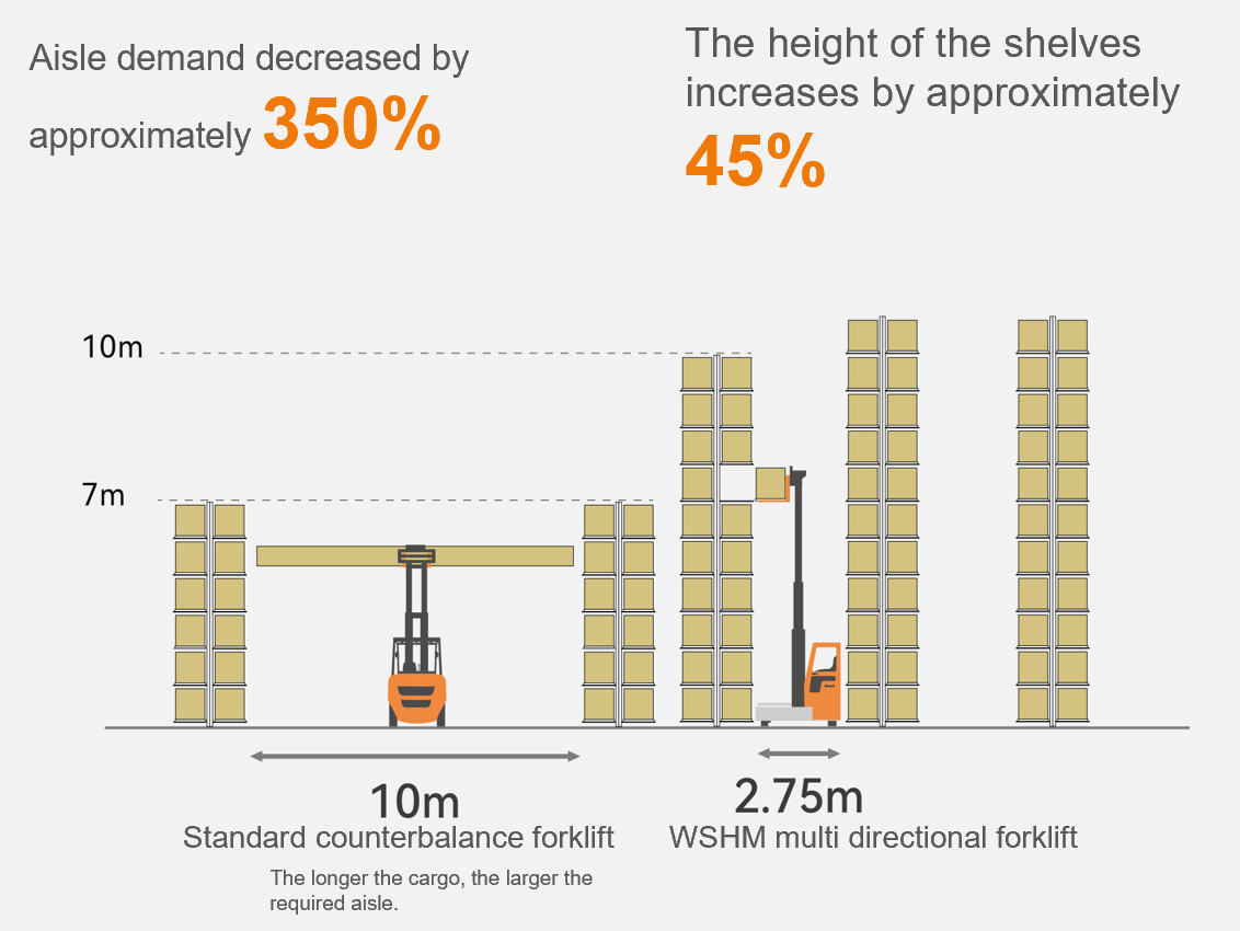 โหมดการขับขี่ที่เป็นเอกลักษณ์นี้ทำให้ WSHM มีข้อได้เปรียบอย่างมากในการจัดเก็บวัสดุที่มีความยาวในทางเดินแคบๆ ช่วยลดความจำเป็นในการใช้ช่องทางการขนย้าย และช่วยให้สามารถวางชั้นวางได้มากขึ้นในพื้นที่จัดเก็บที่มีจำกัดเดิม ซึ่งช่วยเพิ่มประสิทธิภาพการใช้พื้นที่คลังสินค้าได้อย่างมาก